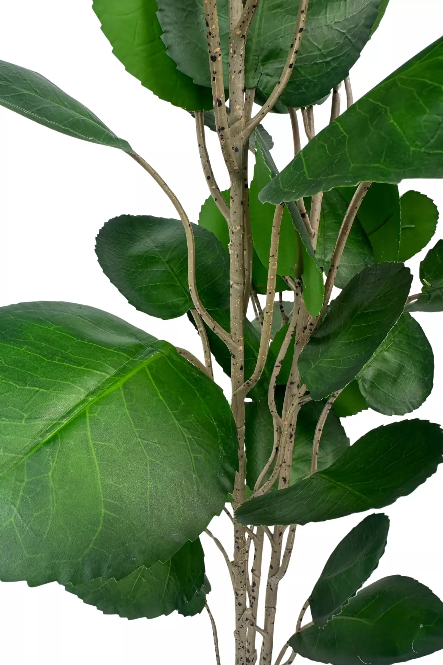 Листья округлой формы с резными краями, что является характерной особенностью аралии. Они выполнены из водонепроницаемого волокна, что делает их долговечными и устойчивыми к внешним факторам. Благодаря 3D-печати прожилок, текстура листьев выглядит максимально естественно. Темно-зеленый оттенок придает растению насыщенный и благородный вид. На обратной стороне листовой пластины расположены усилители, которые помогают листьям сохранять форму.