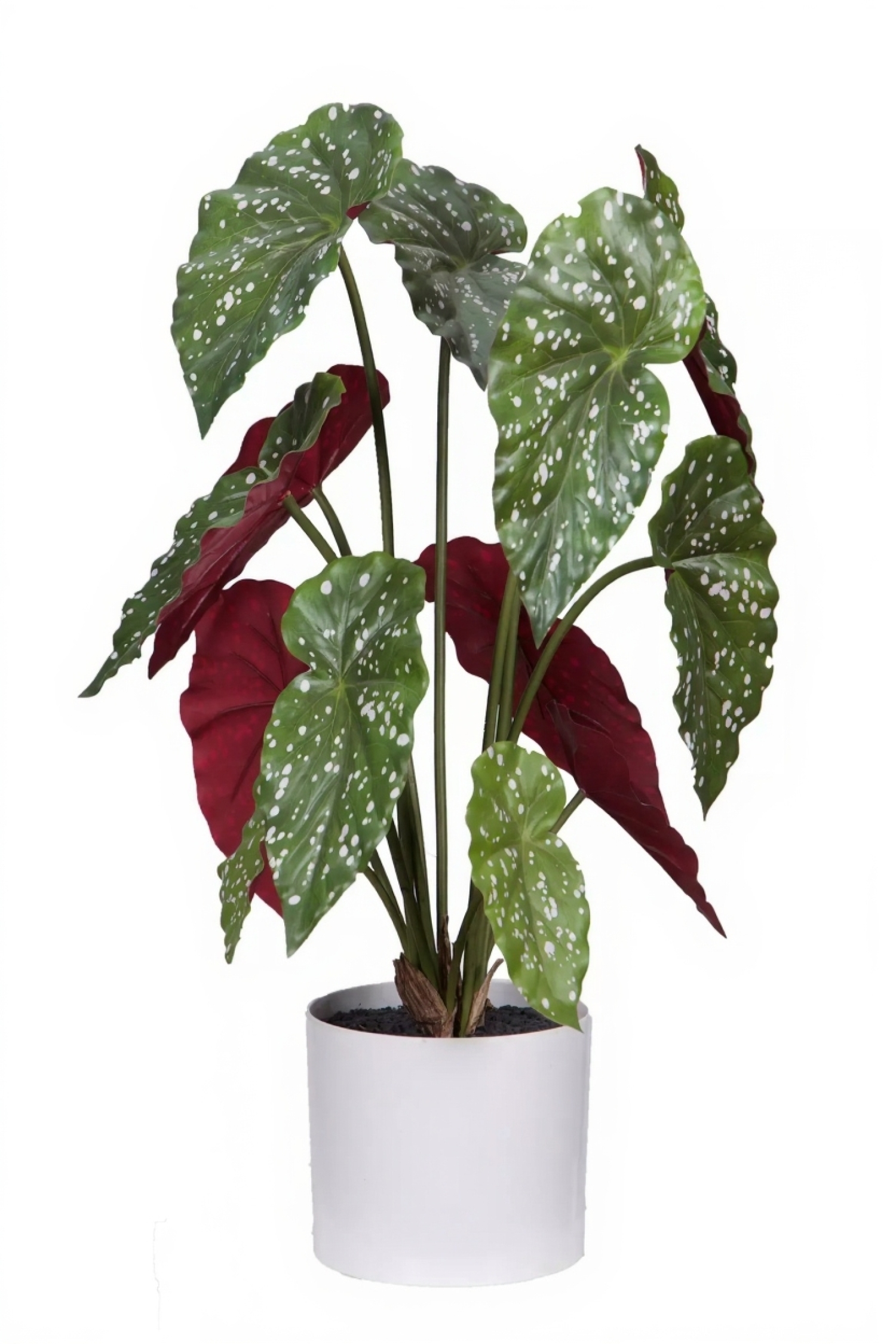 Листья имеют характерный дизайн с белыми хаотичными пятнышками, чётко прорисованными прожилками и лёгкой волнистостью по краям. Они изготовлены из плотного водонепроницаемого волокна, а их обратная сторона выполнена в насыщенном бордовом цвете, что добавляет растению глубину и выразительность. Внешняя сторона листьев обладает тепло-зелёным глубоким оттенком, который легко сочетается с другими декоративными элементами. При прикосновении к листьям ощущаются текстурные впадинки прожилок, что делает их удивительно натуральными на ощупь.