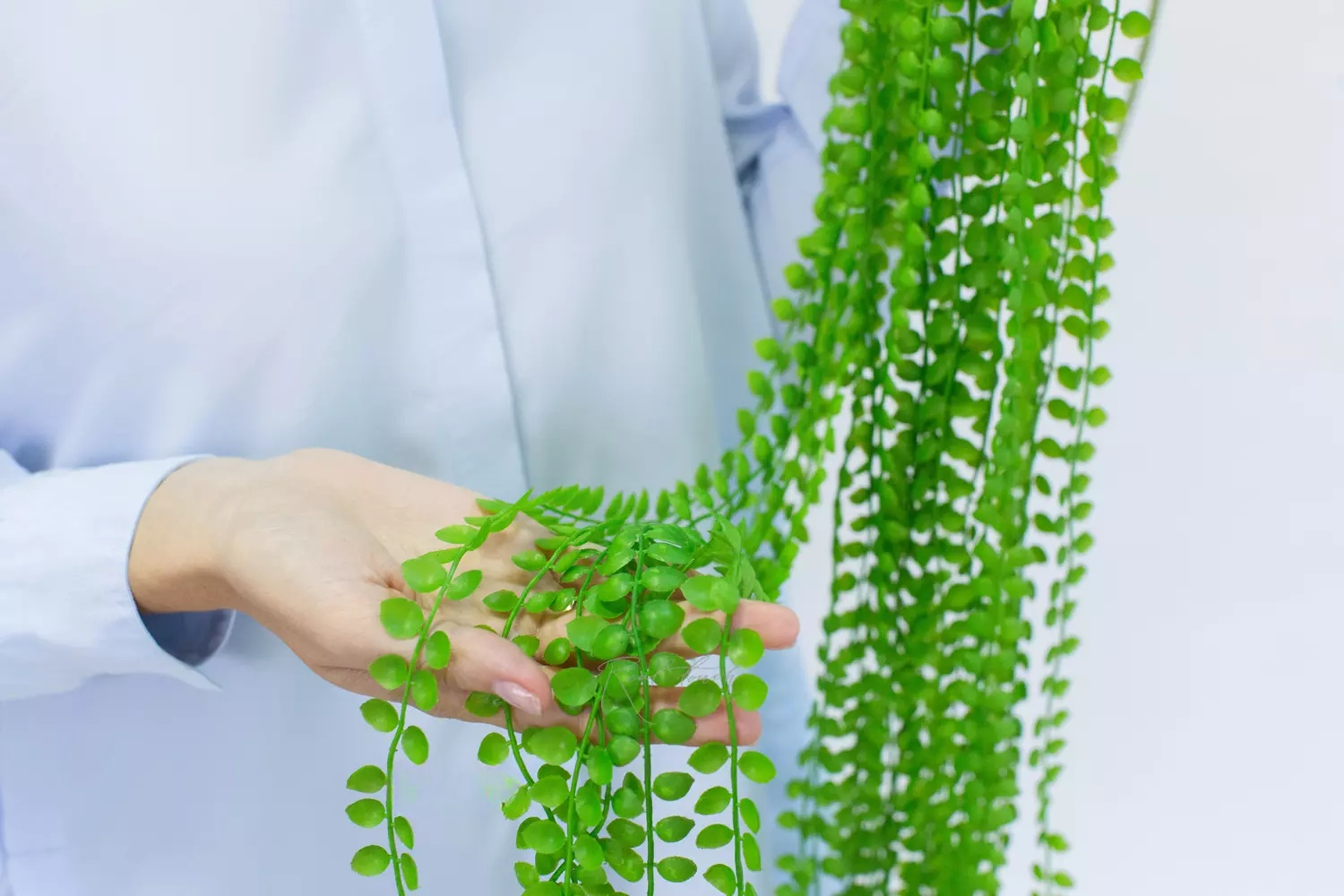 Дисхидия рускусолистная - это декоративное ампельное растение с мелкими сердцевидными листочками. Материал изготовления - мягкий пластик. Благодаря мягкому исполнению листочки имеют выпуклую форму с одной стороны, которая из-за данного решения является лицевой. Обращаем ваше внимание, что это одна из немногих ампельных позиций, где четко разграничены лицевая и обратная сторона.