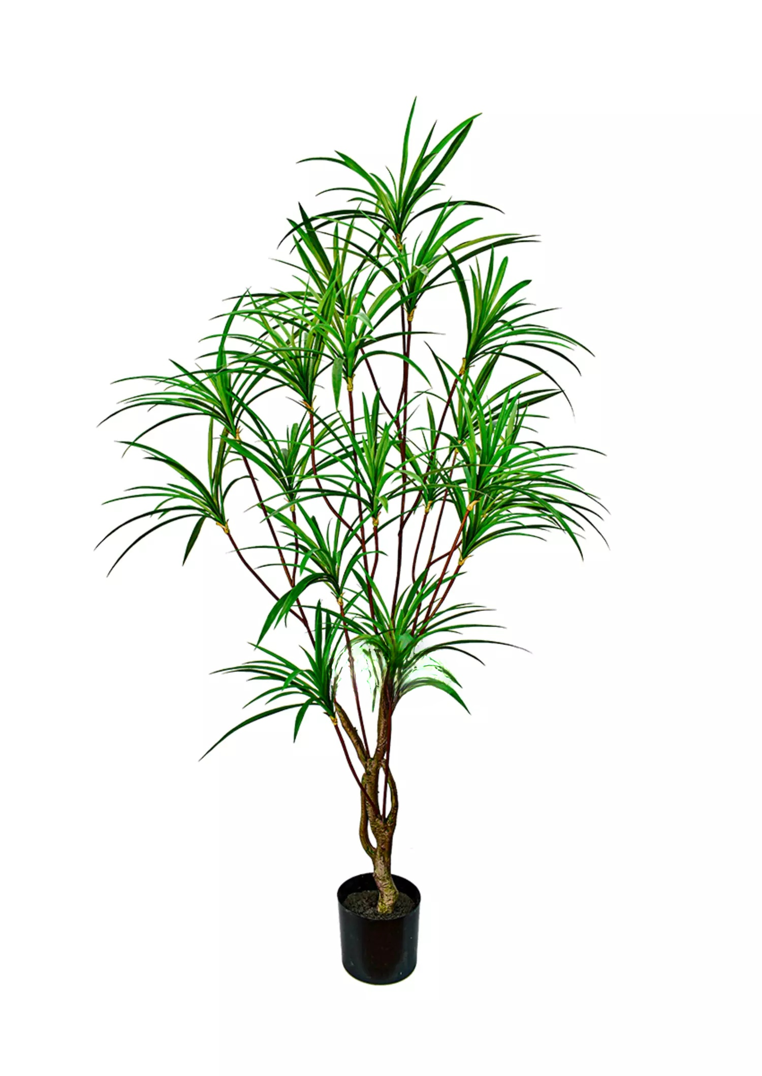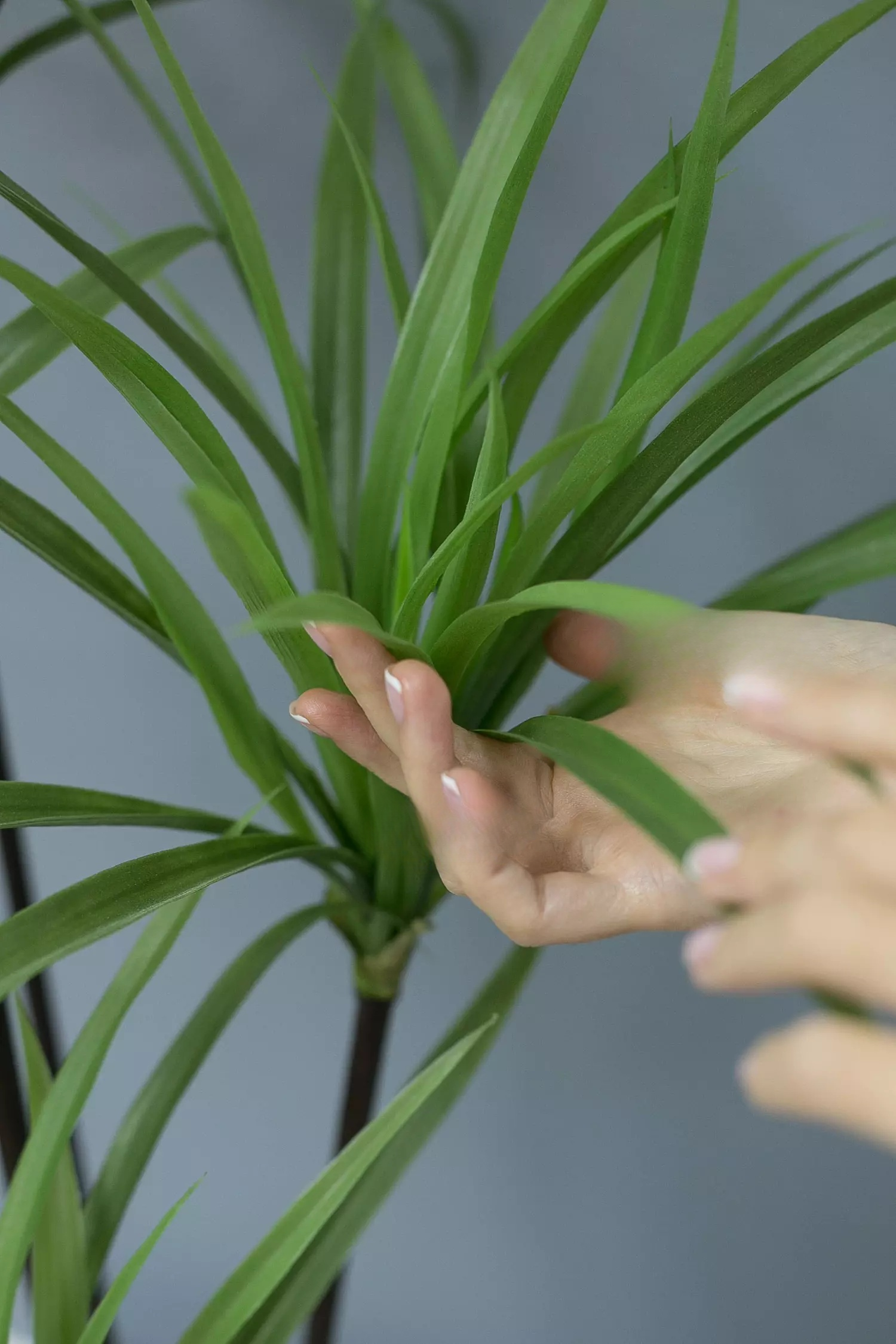Высота 1,9м, состоит из 19 пучков диаметром по 25-30см, материал похож на Ареку, мягкий пластик, но очень близко по ощущениям к плотному силикону. Ствол будто танцующий, очень много воздуха и изящности. Листики легко расправляются.
