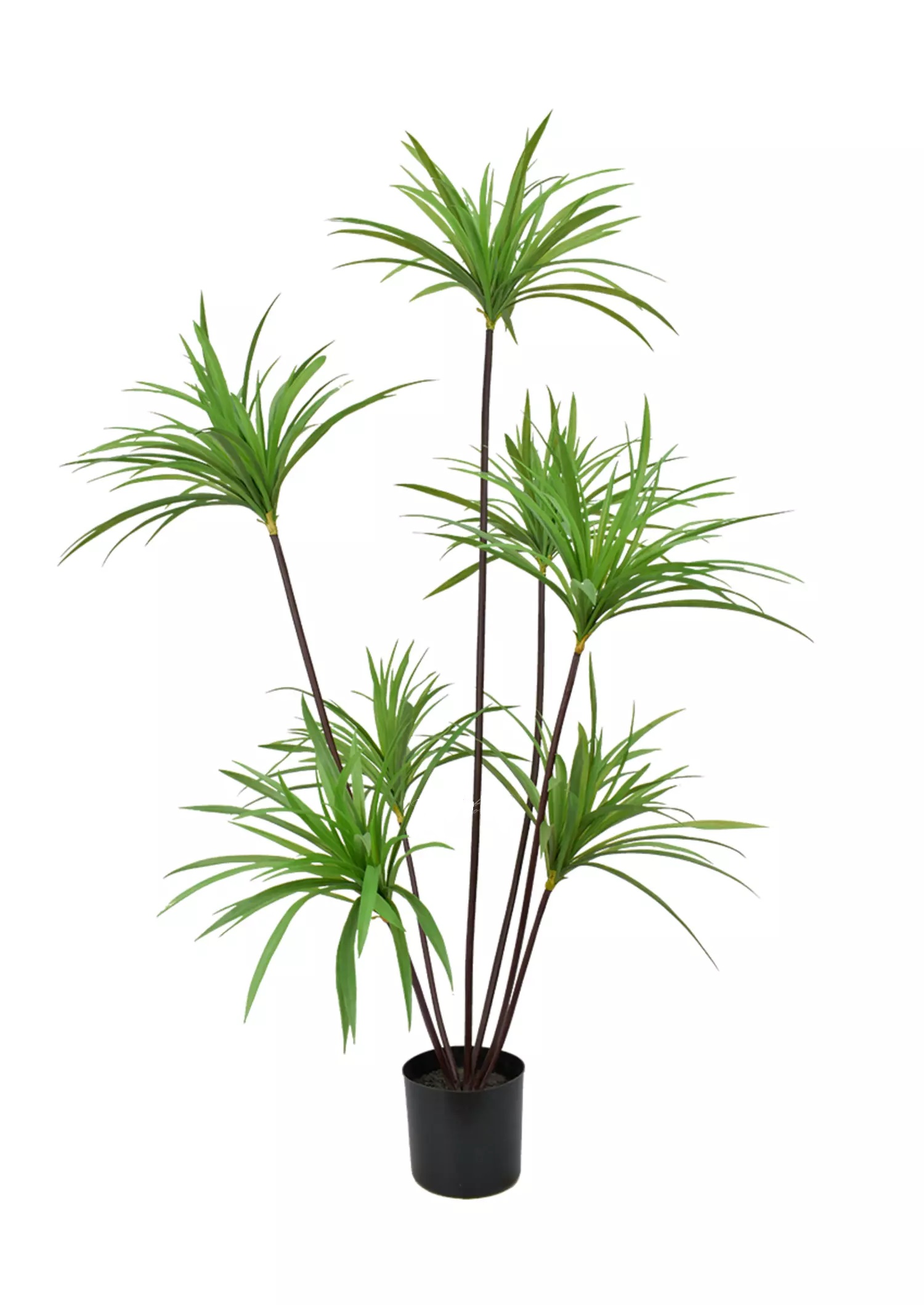 Утонченная, но в то же время пышная драцена - такое впечатление создается благодаря тонким коричневым стеблям разной высоты, которые венчаются "шапками" из множества узких зеленых листьев. Стебли можно раздвинуть, чтобы создать еще больший объем. Между стеблями и листьями есть желтая окантовка, имитирующая опавшие сухие листочки. Листья сделаны из мягкого пластика. Драцены идут в технических кашпо и представлены в 3-х размерах: 120, 150 и 180 см.