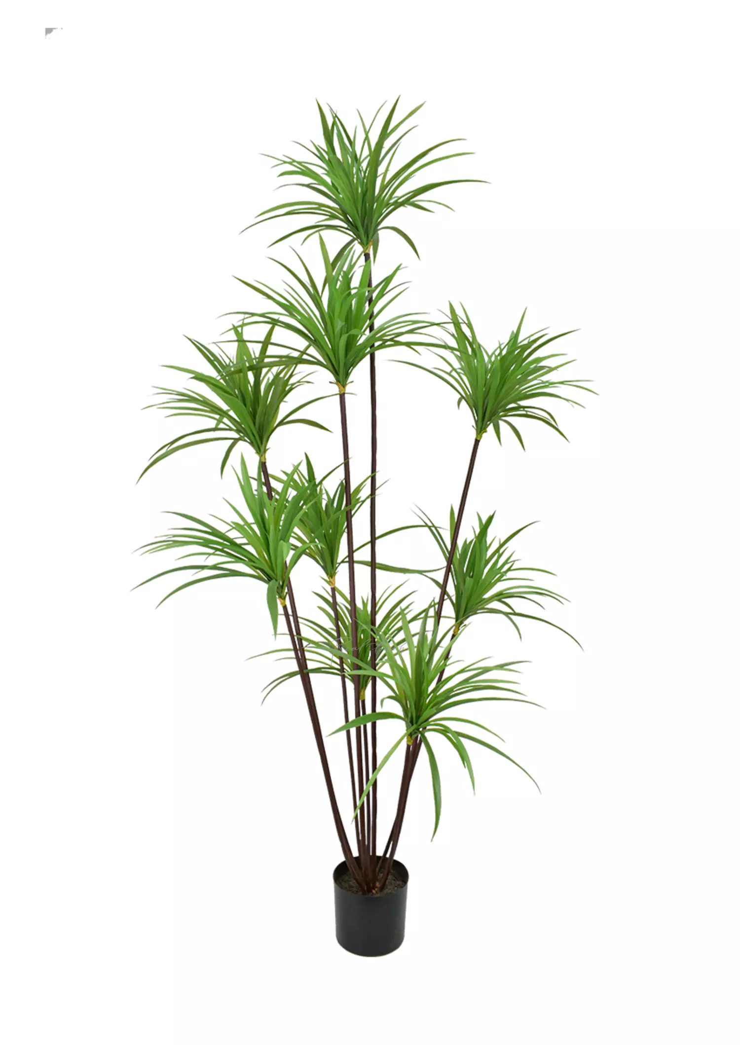 Утонченная, но в то же время пышная драцена - такое впечатление создается благодаря тонким коричневым стеблям разной высоты, которые венчаются "шапками" из множества узких зеленых листьев. Стебли можно раздвинуть, чтобы создать еще больший объем. Между стеблями и листьями есть желтая окантовка, имитирующая опавшие сухие листочки. Листья сделаны из мягкого пластика. Драцены идут в технических кашпо и представлены в 3-х размерах: 120, 150 и 180 см.