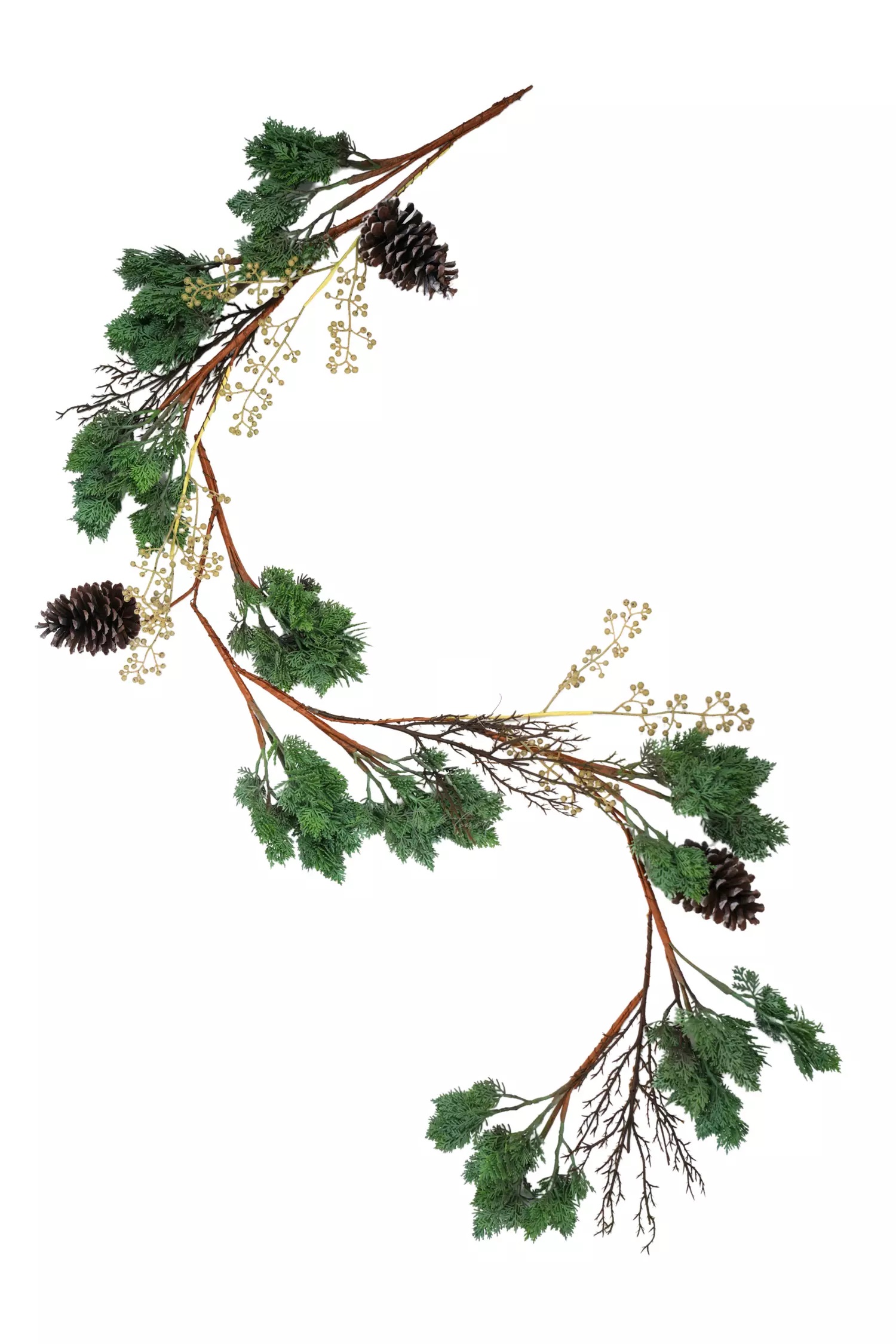 Ответвления состоят из хвойных веточек можжевельника сине-зеленого цвета. Веточки выполнены из мягкого пластика - пушистые и объемные, они отлично передают текстуру хвои. Также в ответвлении есть пластмассовые веточки с ягодами. Ягоды имеют бледно-зеленый цвет и небольшие коричневые вкрапления, а также на них присутствует приятное, матовое напыление. В трех ответвлениях также присутствуют веточки-побеги, без хвои, темно-коричневого цвета и натуральные кедровые шишки большого размера. Все эти детали в сумме делают гирлянду максимально проработанной, детализированной и необычной!