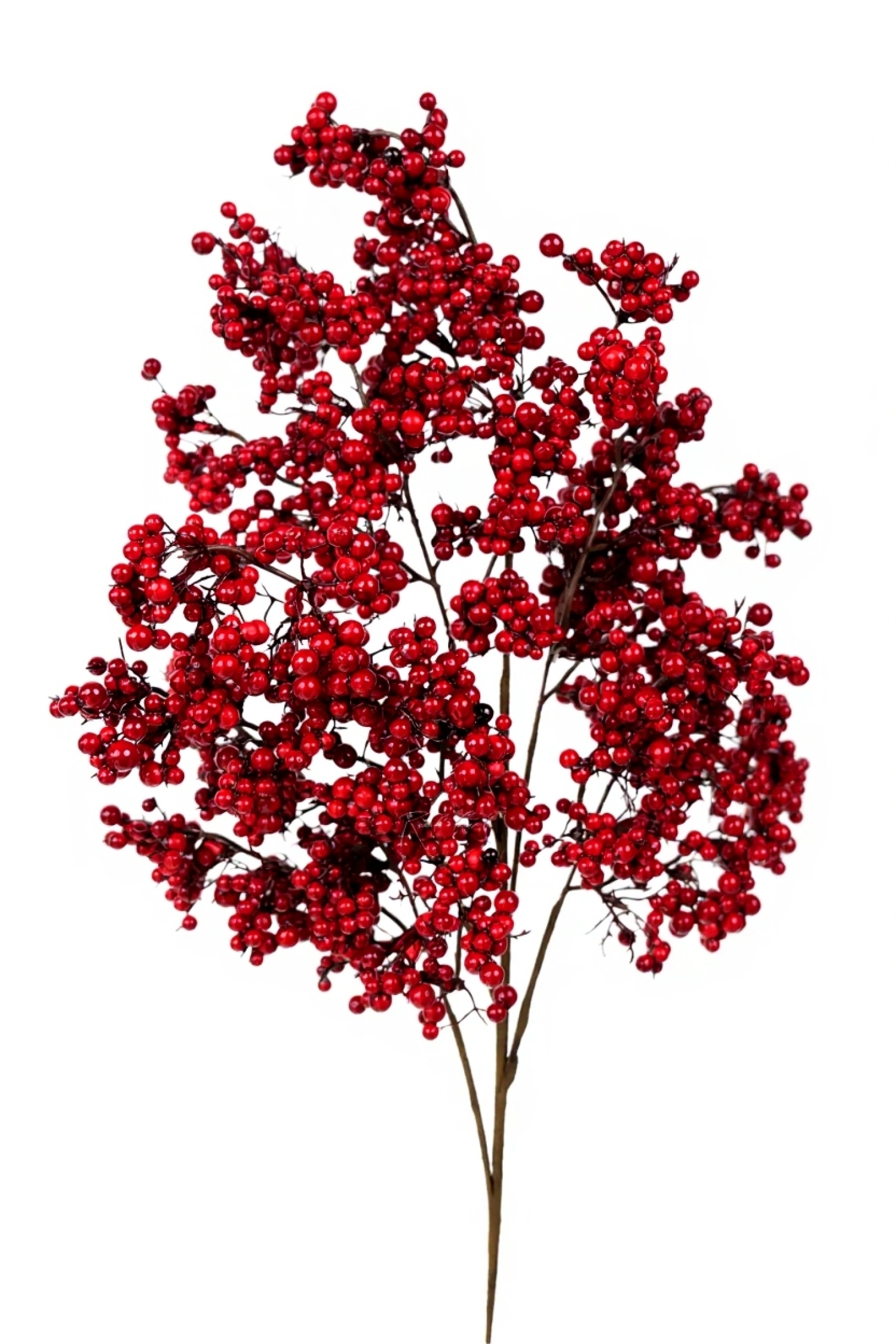 Ветка состоит из 6 основных ответвлений с небольшими, ярко-красными ягодами. Ответвления выполнены из мягкого пластика, к стеблю крепятся с помощью бумажной оплетки в цвет ответвлений. Ягоды идут небольшой скрепленной горсткой вдоль ответвлений. Выполнены ягоды из пеноплекса, сверху покрыты красным лаком, который имеет неоднородное покрытие - где-то чуть больше материала и ягодки потемнее, где-то покрытие меньше и ягоды светлее. Данное решение придает ветке динамичный окрас, наполняя её большей проработкой и детализацией. Также благодаря лаковому покрытию кажется, что ягоды словно покрыты тонким слоем морозного льда!