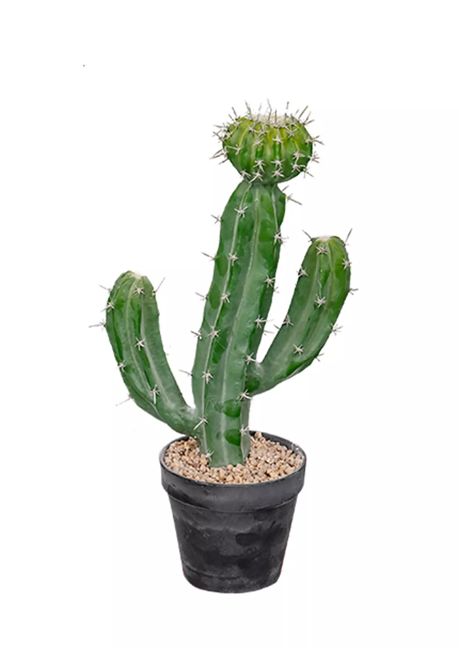 Цельный кактус Цереус Валидус 41см высотой с характерными цилиндрическими ребристыми стеблями и округлой "шапочкой" на центральном стволе. Изготовлен из пластика, пустой внутри, за счет чего достаточно легкий. Напыление ствола, а также часто посаженные светлые иголочки — в точности как у настоящего кактуса. Только наши иголки абсолютно не колючие и даже приятны на ощупь, так как сделаны из силикона. При необходимости для восстановления напыления можно использовать кисть и детскую присыпку. Открытая часть черного технического кашпо декорирована слоем мелких камушек песочного цвета, которые прочно проклеены и не осыпаются. Представлен также в размере 62см.