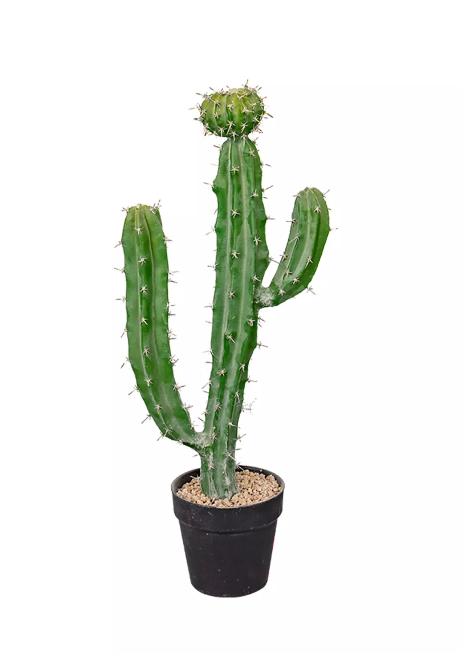 Цельный кактус Цереус Валидус 62см высотой с характерными цилиндрическими ребристыми стеблями и округлой "шапочкой" на центральном стволе. Изготовлен из пластика, пустой внутри, за счет чего достаточно легкий. Напыление ствола, а также часто посаженные светлые иголочки — в точности как у настоящего кактуса. Только наши иголки абсолютно не колючие и даже приятны на ощупь, так как сделаны из силикона. При необходимости для восстановления напыления можно использовать кисть и детскую присыпку. Открытая часть черного технического кашпо декорирована слоем мелких камушек песочного цвета, которые прочно проклеены и не осыпаются. Представлен также в размере 41см.