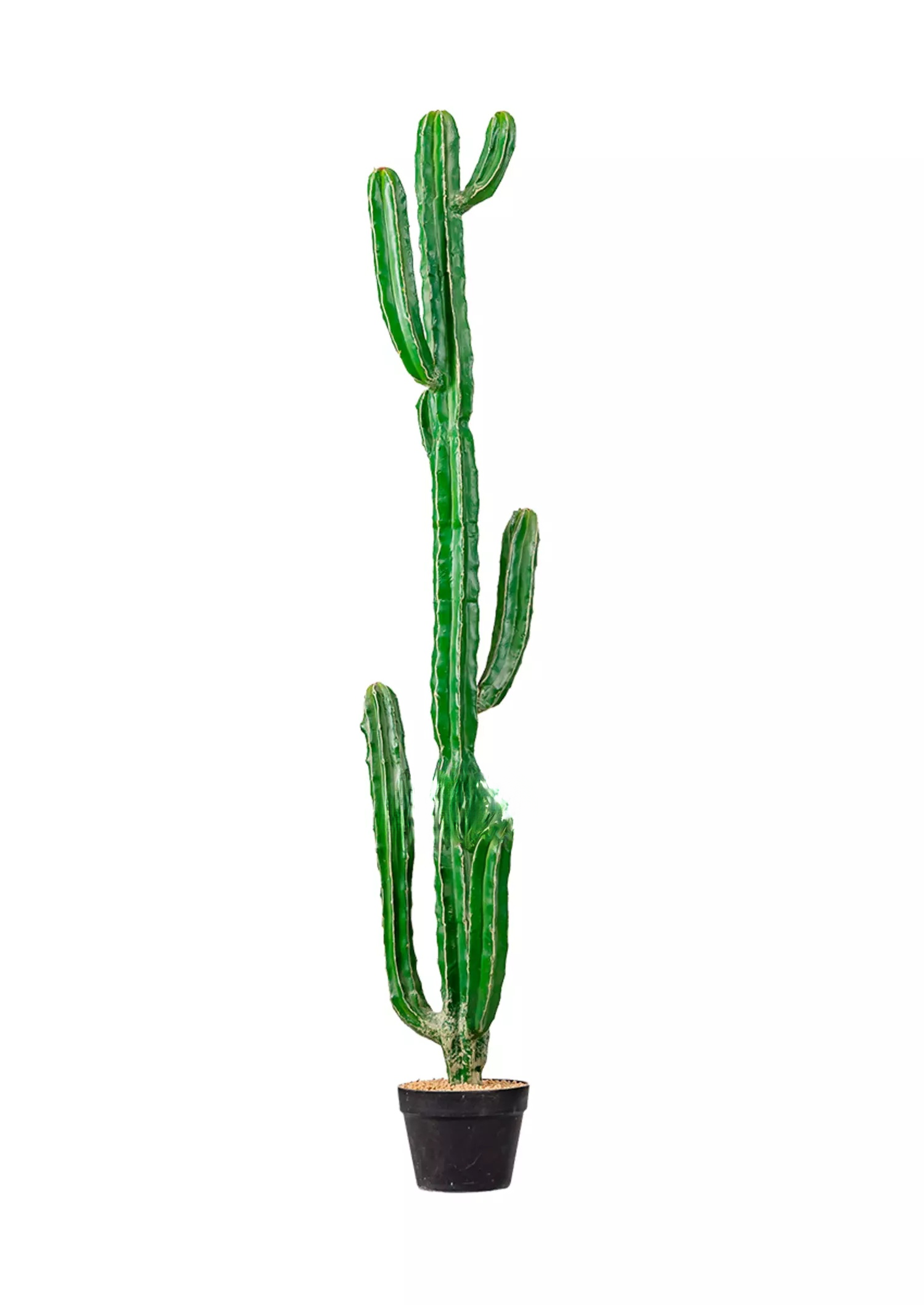 Цельный кактус Цереус Ямакару 147см высотой с характерными цилиндрическими ребристыми стеблями. У кактуса один основной ствол и несколько ответвлений он него. Изготовлен из пластика, пустой внутри, за счет чего достаточно легкий. Все детали в точности как у настоящего кактуса: переход цвета, напыление стволов, а также выпирающие бугорки-иголки. При необходимости для восстановления напыления можно использовать кисть и детскую присыпку. Открытая часть черного технического кашпо декорирована слоем мелких камушек песочного цвета, которые прочно проклеены и не осыпаются. Данный кактус представлен также в размере 105см.
