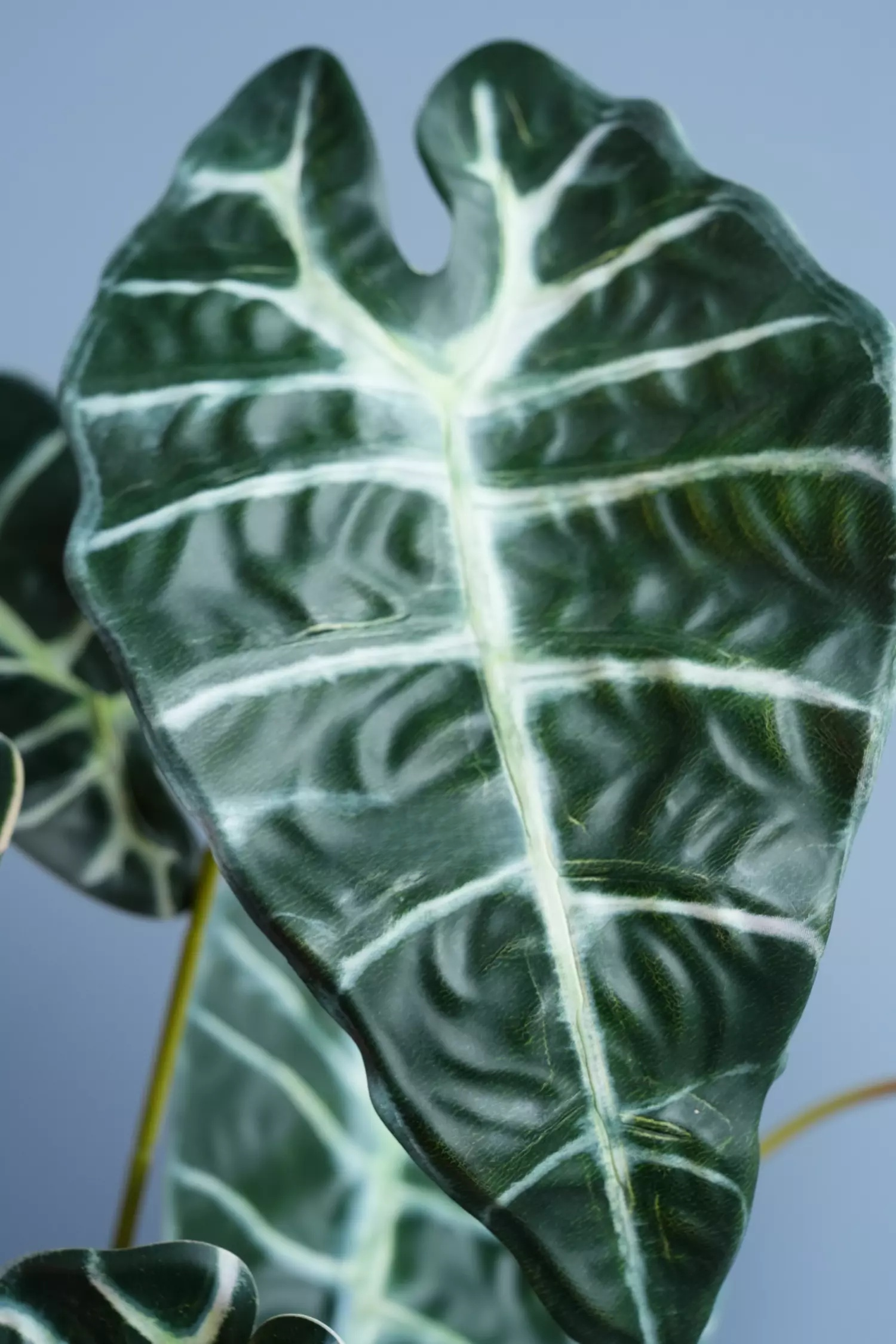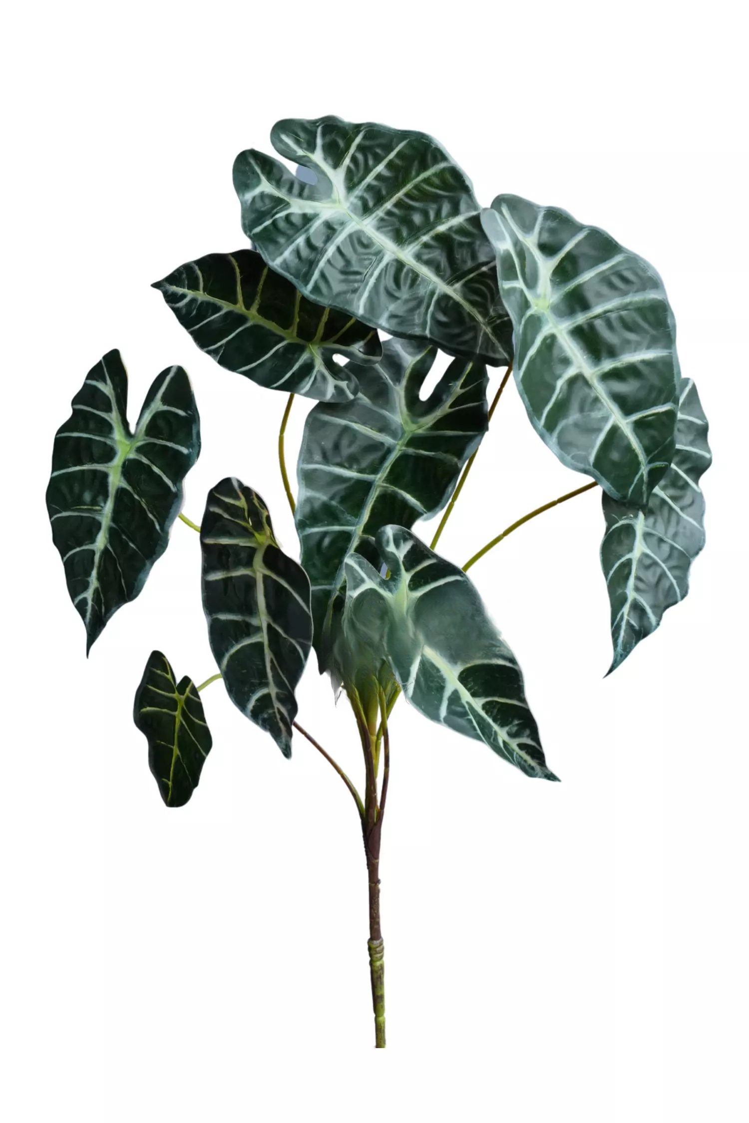 Зеленая часть куста Алоказии составляет 40 см и состоит из 9 ответвлений с листьями. Листья разного размера, выполнены из водонепранецаемого волокна, глянцевые на внешней стороне и матовые на внутренней. Листья темно-зеленого цвета имеют светло-зеленые, контрастные, прожилки. Усилители на обратной стороне задают листу волнистые изгибы по краю. С обратной стороны лист имеет светло-зеленый окрас с небольшим фиолетовым градиентом по краям. На фоне светло-зеленой основы листа практически не видно пластиковых усилителей.