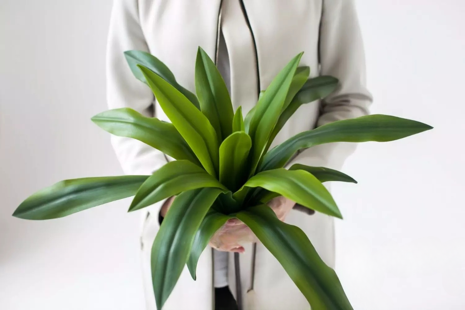 Материал изготовления — мягкий силикон, который приятен на ощупь и полностью повторяет текстуру натуральных листьев. Однако стоит учитывать, что при частых манипуляциях, неверных сгибах или чрезмерных нагрузках листья могут закручиваться и терять свою первоначальную форму. Заломы на листовых пластинах не возвращаются, поэтому важно бережно обращаться с растением.