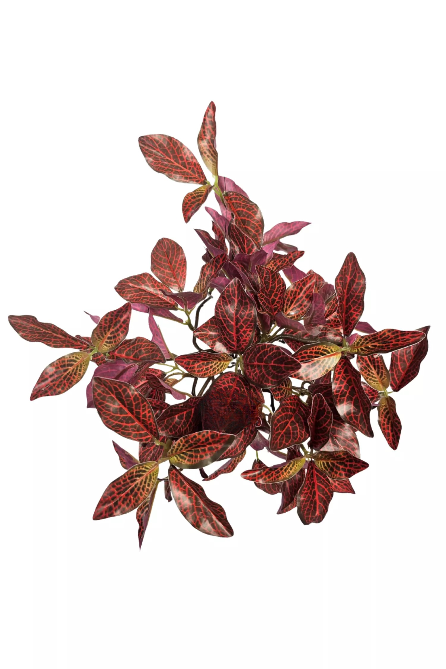 Куст Фиттонии состоит из небольшого пластикого стебля, который также служит техническим креплением для монтажа, и множества извилистых ответвлений с яркими, пестрыми листьями. Гладкие листья выполнены из водонепроницаемого полимерного волокна. Также листья фиттонии имеют волнистые края листовой пластины, что придает листьям не только визуальную, но тактильную реалистичность. Листья имеют неоднородный окрас: темно-коричневый с красными прожилками. Также у некоторых листьев снизу имеется светлый оттенок зеленого, который плавно переходит в основной цвет.