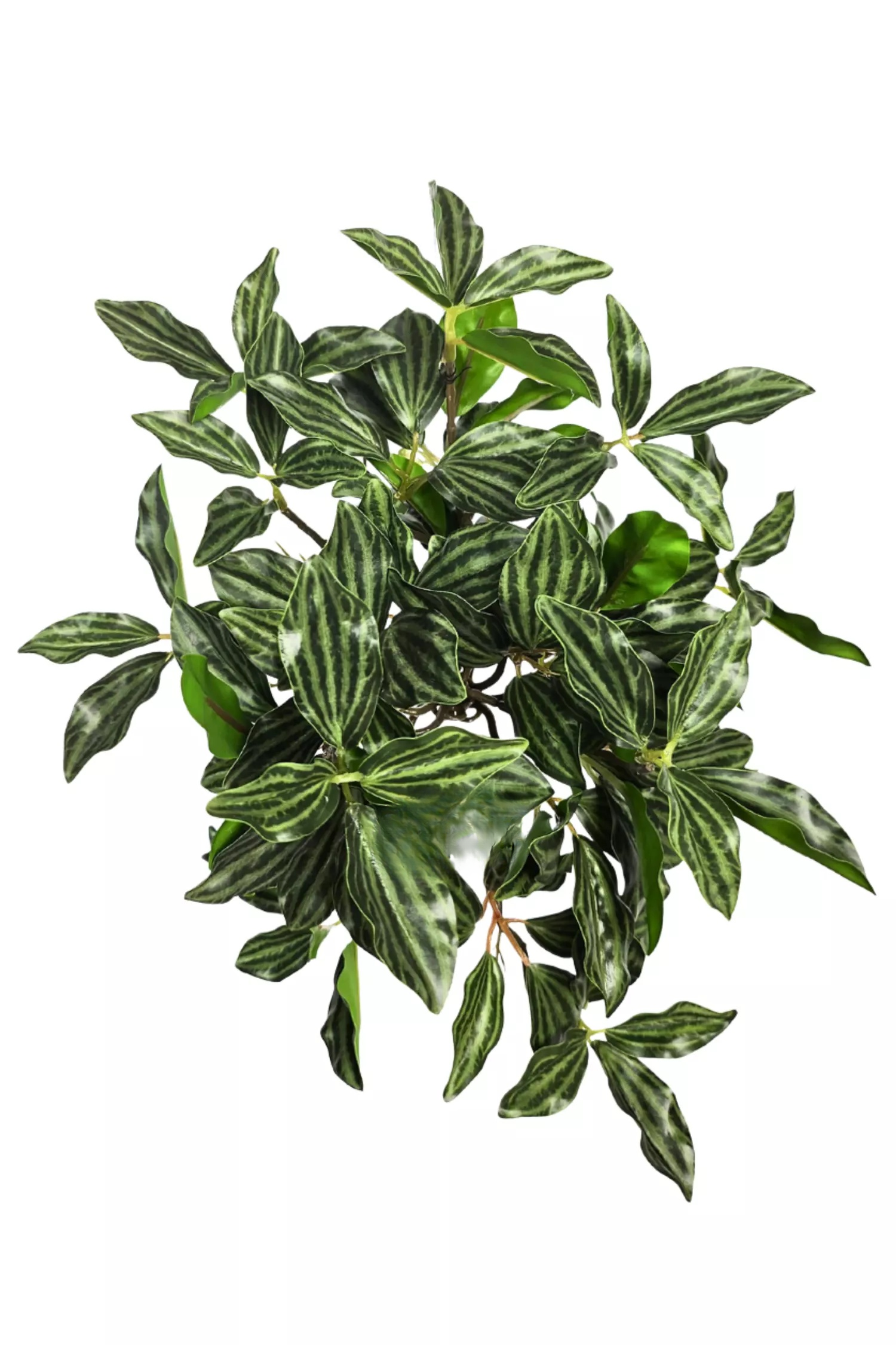 Куст Пеперомии состоит из небольшого пластикого стебля, который также служит техническим креплением для монтажа, и множества извилистых ответвлений пестрыми листьями. Гладкие листья выполнены из водонепроницаемого полимерного волокна. Также листья пеперомии имеют волнистые края листовой пластины, что придает листьям не только визуальную, но тактильную реалистичность. Листья имеют неоднородный окрас: темно-зеленый лист со светло-зелеными продольными полосками.