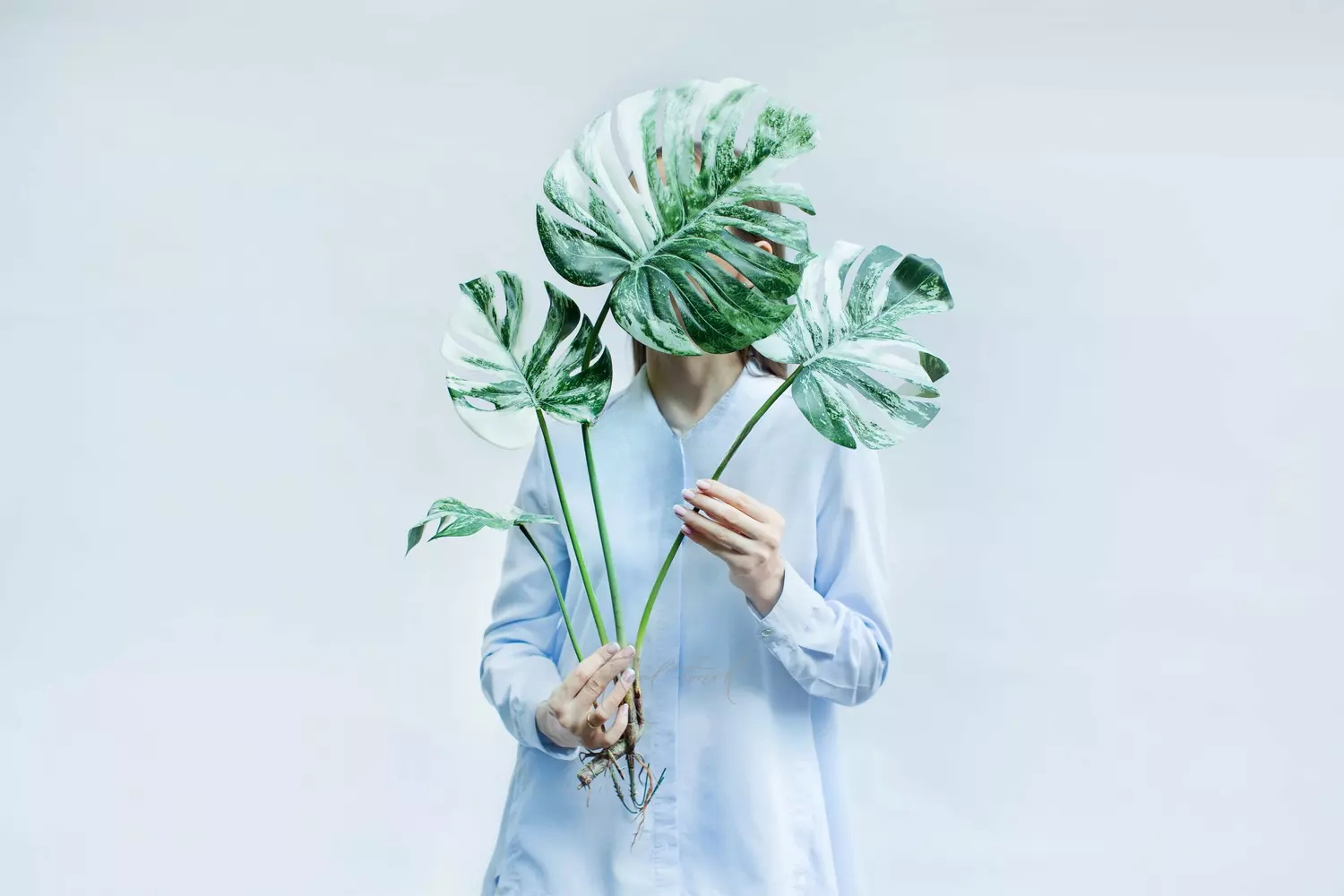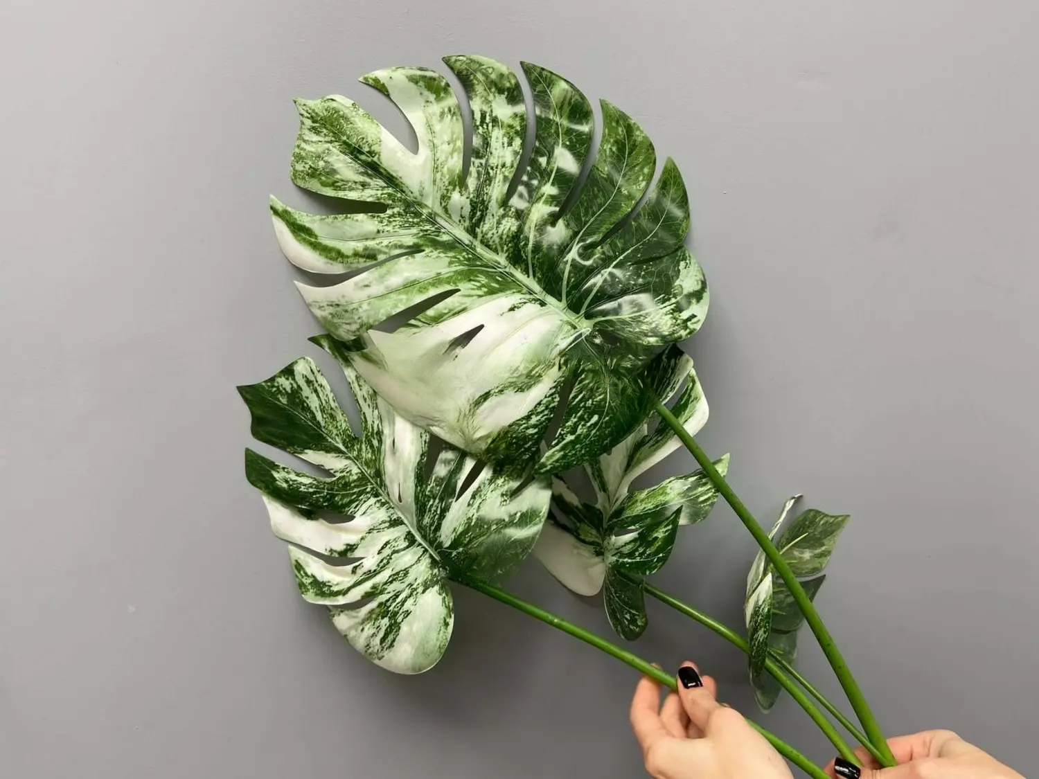 Монстера вариегата — вид, который часто используют в оформлении интерьеров. Она обладает пестрыми бело-зелеными листьями. У живой монстеры с возрастом площадь белого цвета увеличивается или совсем исчезает, а наша монстера будет эффектно выглядеть в интерьере и радовать необычным окрасом так долго, как вы этого захотите. Куст состоит из 4 листьев разного размера. Высота до основания 75см, основание для высадки 13см, корни 14 см. Материал плотный, но цвет сохраняется и на обороте, придавая листу максимальную естественность. Перед работой рекомендуем отправить, чтобы листики расправились, если были замятия при транспортировке.