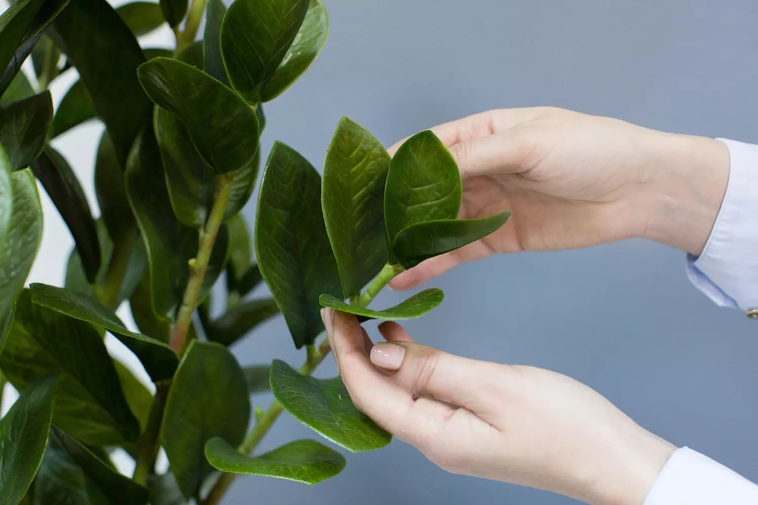Листья выполнены из плотного силикона, что делает их тяжелыми и придает кусту натуральный вид. На каждом листе проработаны прожилки, подчеркивающие реалистичность текстуры. Как и живое растение, этот замиокулькас состоит из множества отдельных ответвлений, выполненных из пластика. Внутри конструкции нет проволоки, что сохраняет естественность формы.
