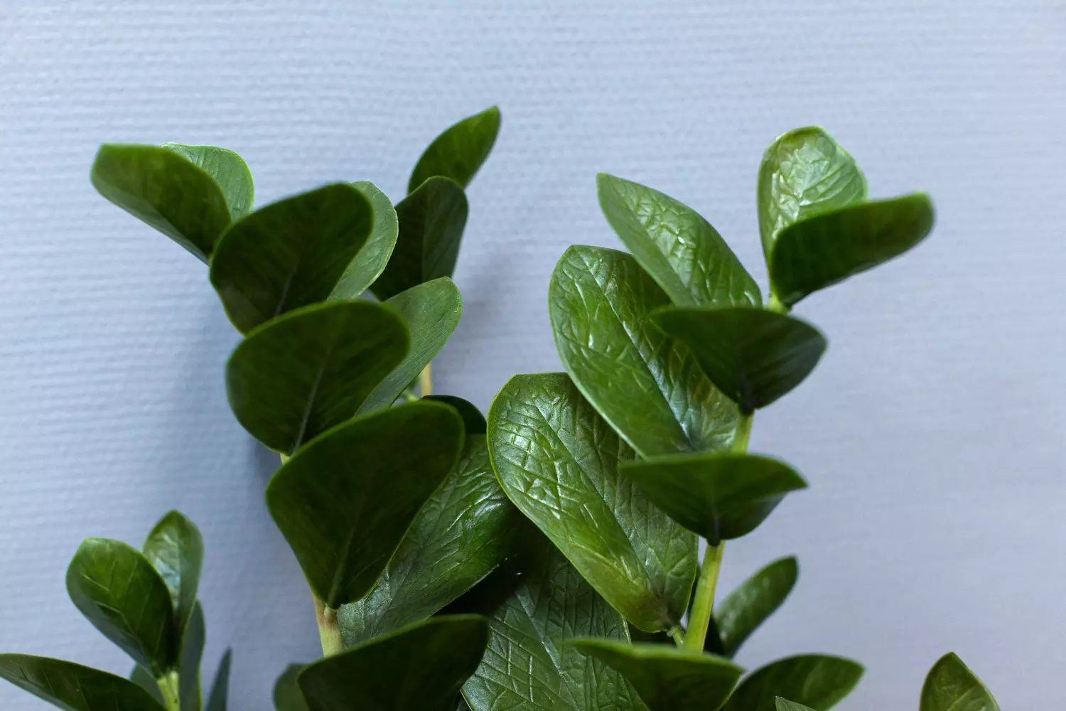 Листья выполнены из плотного силикона, что делает их тяжелыми и придает кусту натуральный вид. На каждом листе проработаны прожилки, подчеркивающие реалистичность текстуры. Как и живое растение, этот замиокулькас состоит из множества отдельных ответвлений, выполненных из пластика. Внутри конструкции нет проволоки, что сохраняет естественность формы.