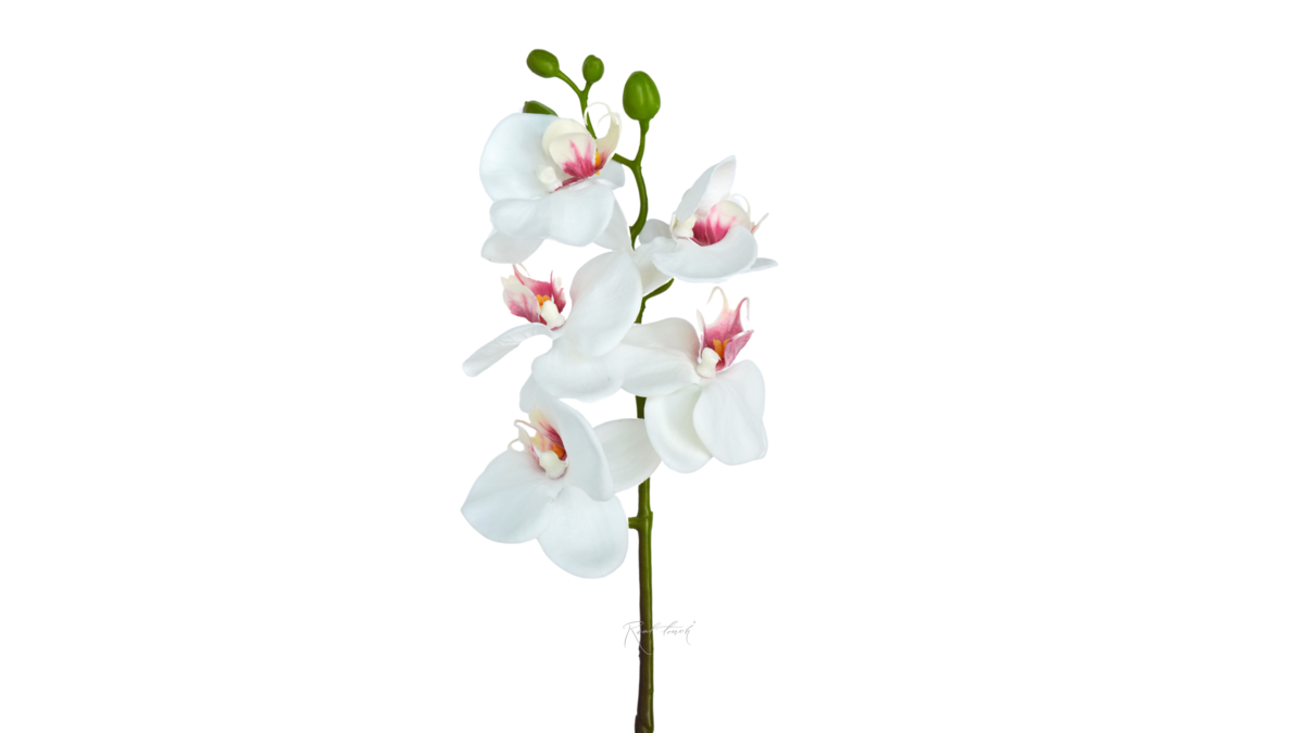 Стебель выполнен из пластика, внутри которого идет проволока, что позволяет задать веточке нужные изгибы и направления. Стебель имеет плавный переход от коричневого цвета от основания к зеленому цвету в цветочной части орхидеи. Стебель литой, гладкий, плавно переходящий и в ответвления к открытым соцветиям, и к плотным, закрытым соцветиям. Обращаем ваше внимание, что в ответвлениях к соцветиям проволоки нет.