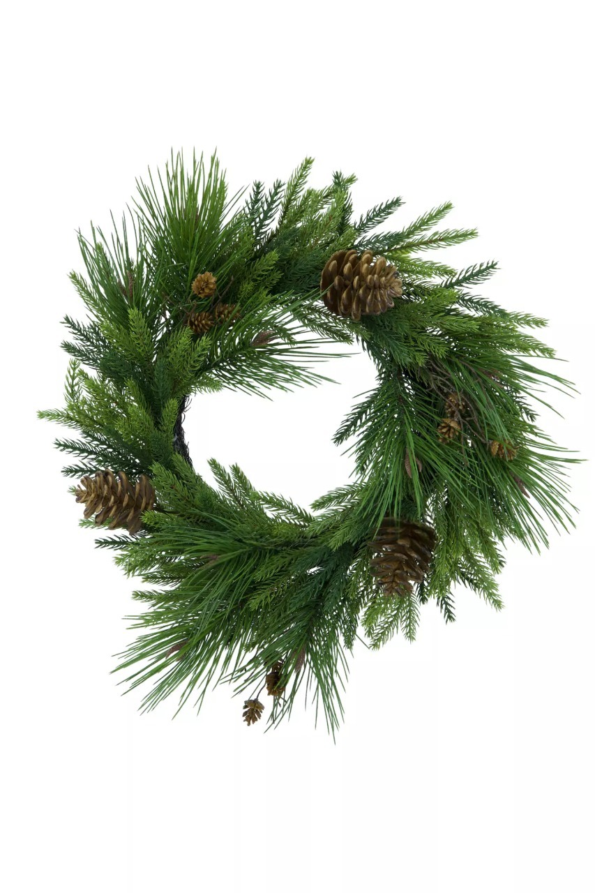 Данная модель новогодних венков представлена в трех размерах: диаметром 45, 55 и 70 сантиметров. Венок состоит из 2-х видов хвои: ель с короткими иголками и сосна с длинными. Также стоит обратить внимание на шишки, так как они искусственные, мягкие на ощупь, они не будут крошиться при транспортировке и их не нужно будет заменять. Сами шишки разного размера: от крохотных малышей до достаточно больших. Очень необычный венок с реалистичной хвоей, можно украсить небольшими игрушками, огоньками и использовать в декоре интерьера.