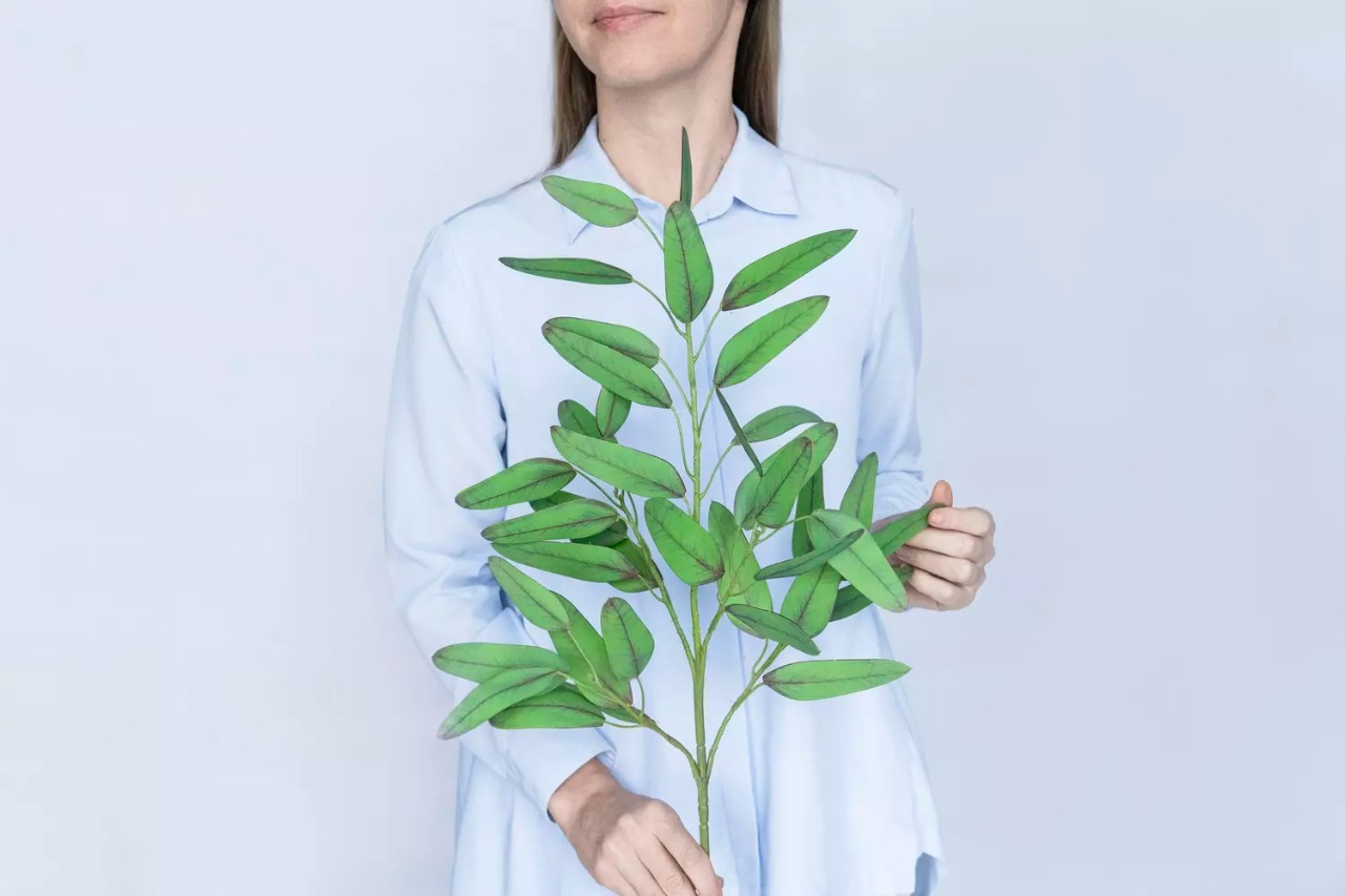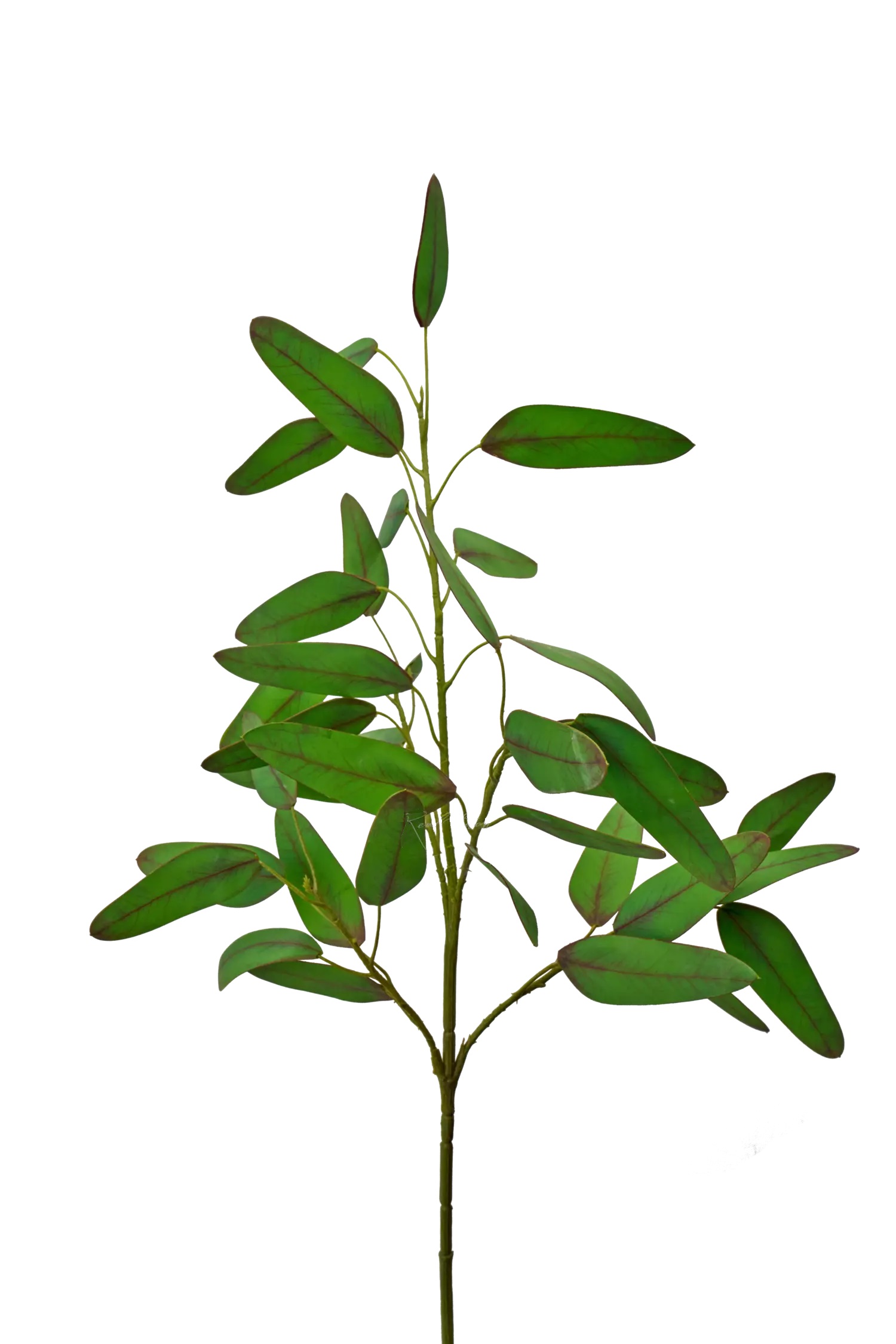 Ветка эвкалипта имеет 4 крупных ветки, за счет которых создается объем и множество маленьких веточек. Общая длина 60 сантиметров. Растение обладает большим количеством листиков с 3D печатью на водонепроницаемом полимерном волокне (3DWCF). Цвет растения - светло- зеленый, жилки на листиках фиолетового цвета.