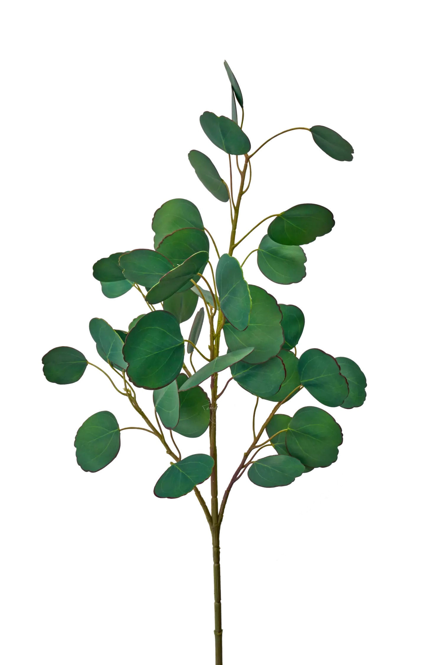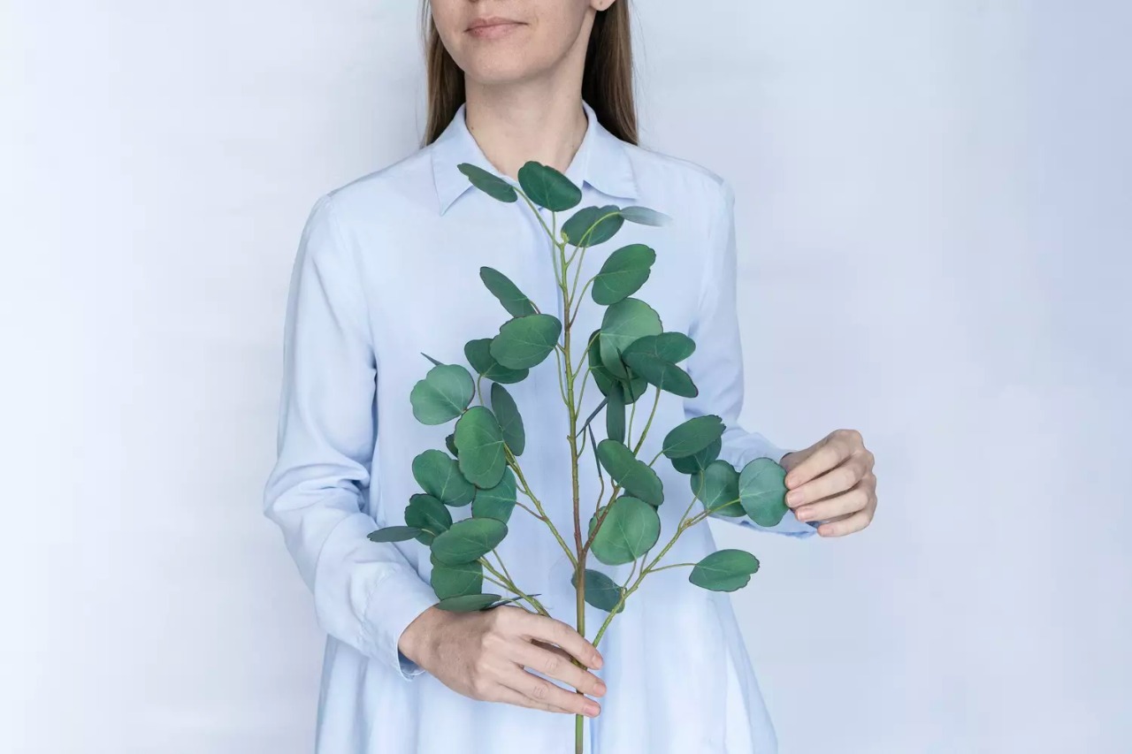 Ветка эвкалипта имеет 4 крупных ветки, за счет которых создается объем и множество маленьких веточек. Общая длина 60 сантиметров. Цвет растения - зелено-голубые. Растение обладает большим количеством округлых листиков с 3D печатью на водонепроницаемом полимерном волокне (3DWCF). Объемные ветки эвкалипта отлично сочетаются с другими цветами и зеленью, создавая изысканные композиции.