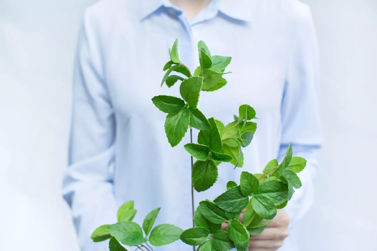 Хочется бежать заваривать вкусный чай с мятой, когда открываешь коробку с такими зелеными «полями». Веточки аккуратные, изящные, гибкие с листиками разного размера, восхитительной проработкой деталей. Материал – водонепроницаемое полотно с 3D печатью. Высота 70см, с 3 ответвлениями. Стебельки тоненькие, безупречные, с розеткой из 4 листочков. Что восхищает? Цвет глубокий зеленый цвет, естественные прожилки, который делают листочки более живыми, идеальная форма, которая не требует дополнительного отпаривания в большинстве случаев, аккуратные зубчатые края.
