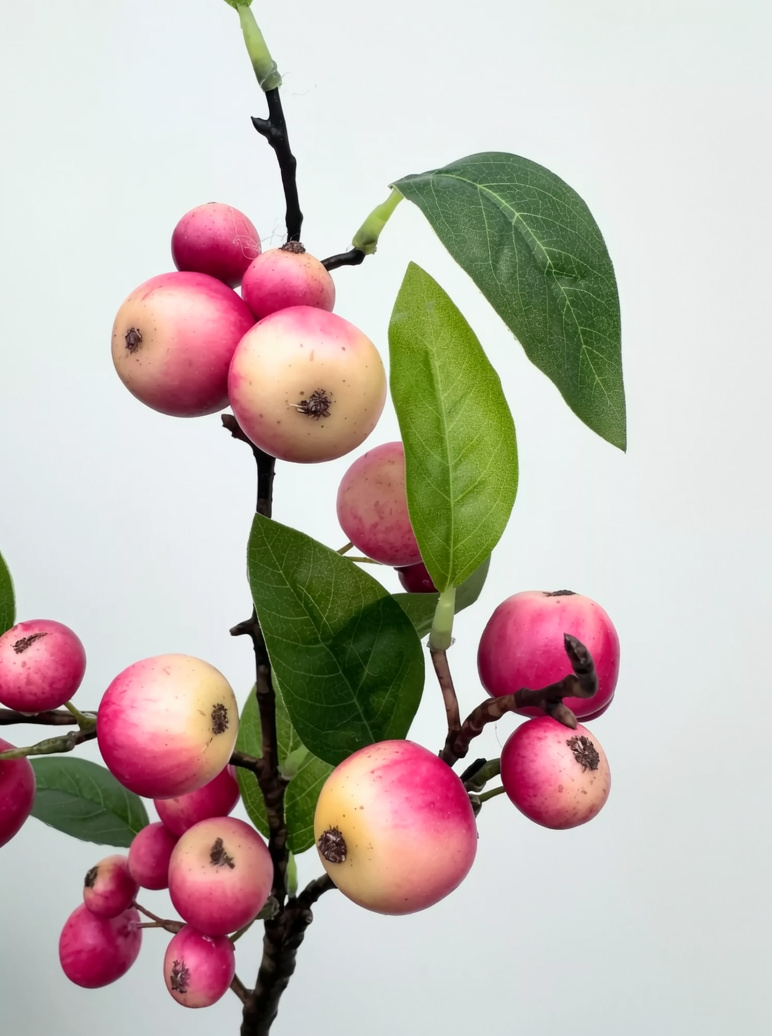 Ветка состоит из основного стебля и 4 ответвлений, на которых расположены миниатюрные яблоки. Плоды выполнены из пеноплекса и покрыты матовой глазурью, создающей эффект свежести. Особое внимание уделено цвету: на яблоках присутствует розово-желтый градиент, максимально приближенный к естественному оттенку настоящих ранеток. Дополняет реалистичность флокированный чашелистик, выполненный из мягкого коричневого флока.