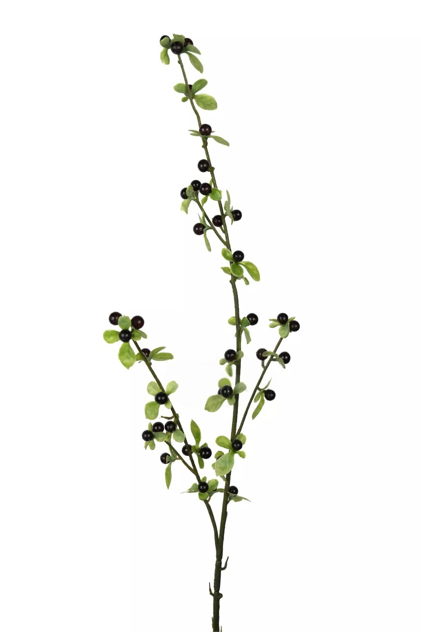 Ветка состоит из основного стебля и нескольких тонких, изящно изогнутых ответвлений, на которых расположены небольшие ягоды черного цвета. Плоды выполнены из гладкого твердого пластика, имеют аккуратную округлую форму с лёгким блеском, что придаёт им естественный вид. Небольшие листья светло-зелёного оттенка выполнены из мягкого пластика и расположены рядом с ягодами, добавляя ветке мягкости и гармонии.
